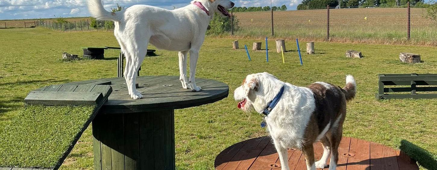 1 acre secure paddock · 5–6ft fencing with vegetation screening · All breeds welcomed · XL Bullies/exempt dogs permitted with prior authorisation · Enrichment equipment & seating