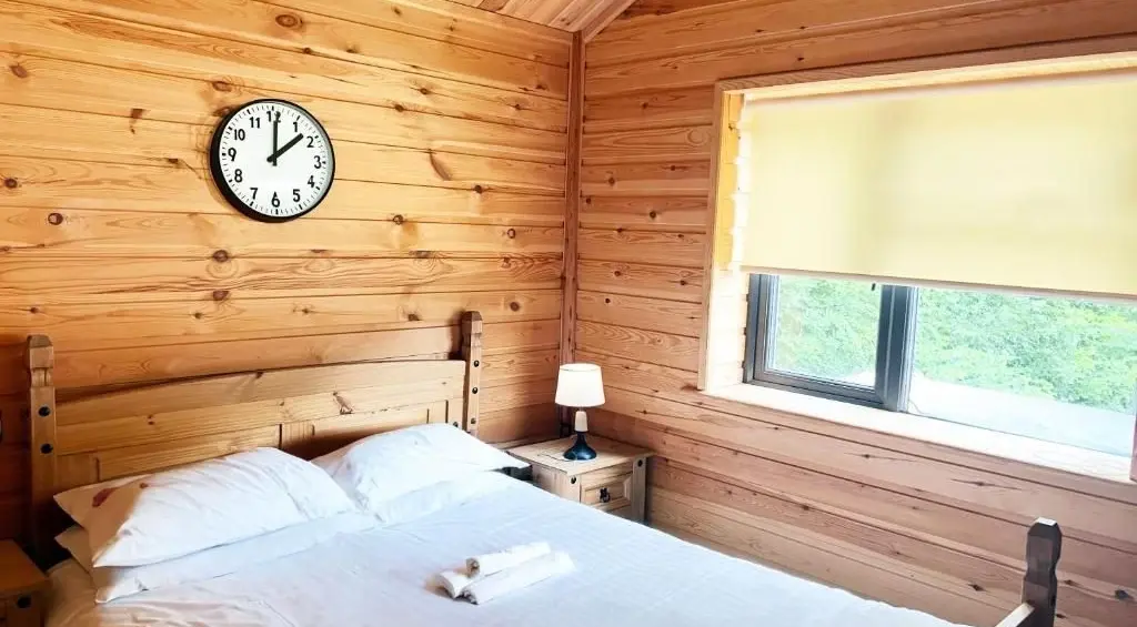 The fully equipped kitchen includes an oven, fridge, and all essential amenities, giving you the freedom to enjoy meals at your own pace. The cabin’s warm, cosy interior sets the tone for a peaceful stay in the heart of the countryside.
